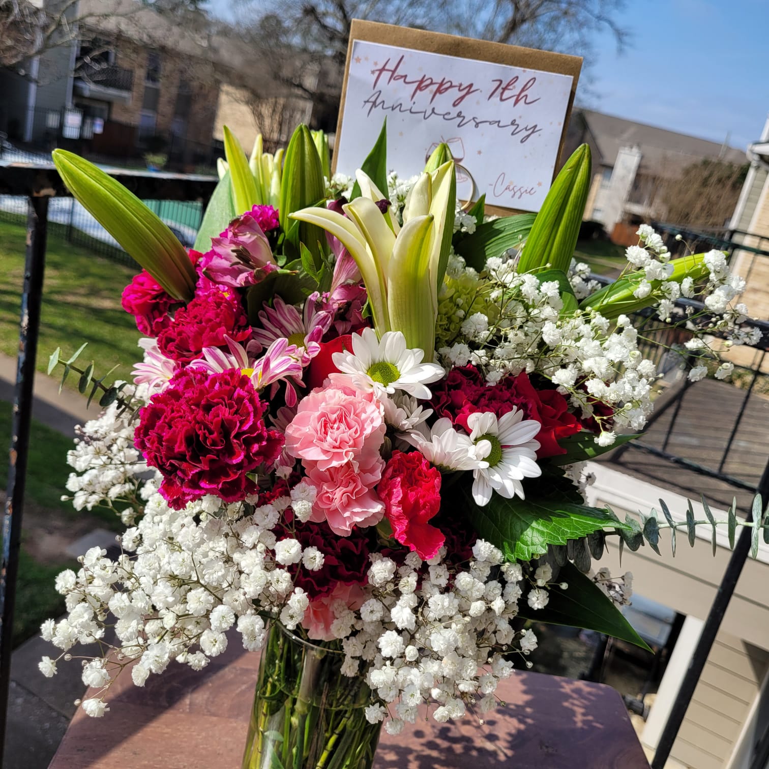 Celebrate love that stands the test of time with Eternal Embrace. This exquisite floral arrangement brings together the purity of white lilies, the passion of deep red carnations, the gentleness of daisies, and the softness of baby’s breath, all elegantly arranged in a clear glass vase. Whether it’s an anniversary or a special moment of appreciation, this bouquet is a timeless expression of affection and care.